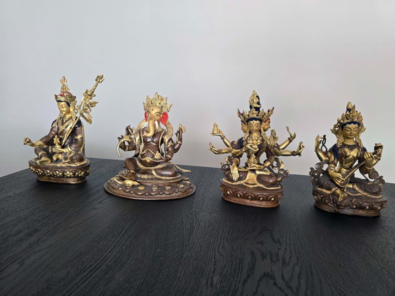 aangeboden deze 4 hele mooie met de hand gemaakte beelden. Beeldjes zijn gemaakt door de meester ambachtslieden van de 4e generatie van de “shkya clan” in patan nepal ze zijn van verguld koper en/of bladgoud en afgewerkt met koraal, turkoois en de gezichten zijn met een speciale goudverf beschildert. Beelden zitten vol met schitterende details. Wij hebben ze gekocht op onze vakanties in 1993 en 1995 in nepal. Wij zijn in de (familie) werkplaats geweest in patan waar deze beelden met de hand werden gemaakt.