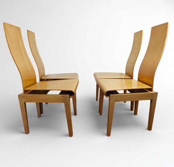 eetkamerstoelen van de Italiaanse designer Finazzer. De stoelen hebben een modern en zijn een schoolvoorbeeld van postmodern design uit de jaren 80. Het elegant gebogen multiplex en de hoge rug geven de stoelen een verfijnde, bijna architectonische uitstraling.