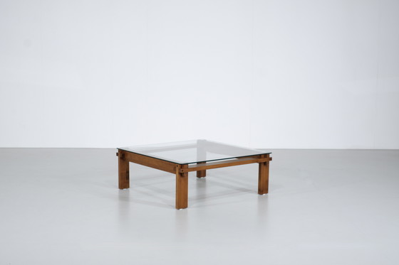 Prachtige vierkante eiken salontafel ontworpen in de jaren 1970.