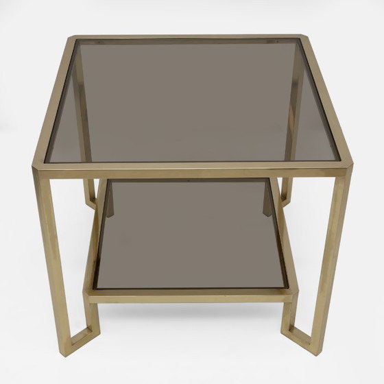Vintage salontafel toegeschreven aan Guy Lefevre voor Maison Jansen, circa jaren 70, Frankrijk. Hoogwaardig neoklassiek messing frame met geometrische vierkante vormen en glazen blad. Beide rookbruine glazen vlakken zijn de originele vintage exemplaren en verkeren in uitstekende staat, zonder barsten of beschadigingen. Dit is een zeldzaam stuk, omdat het frame ook is afgewerkt met een aantrekkelijke chromen rand rondom beide glazen vlakken, wat het ontwerp extra diepte en allure geeft (de meeste van deze tafels werden alleen van messing gemaakt).