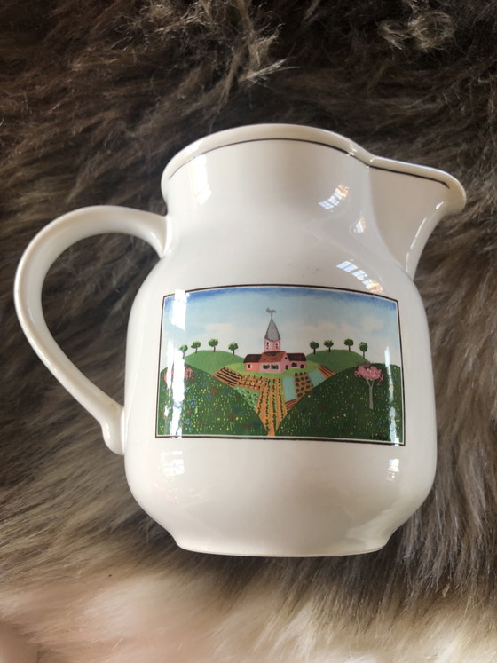 - De melkkan is versierd met een kleurrijke en gedetailleerde afbeelding die een rustiek landschap uitbeeldt, wat een vleugje landelijke charme toevoegt aan uw tafelsetting.