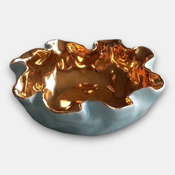 Handgevormde uitvoering met vrije, golvende organische rand. De buitenzijde is afgewerkt met een zacht lichtblauw glazuur. De binnenzijde is volledig voorzien van een goudluster afwerking.