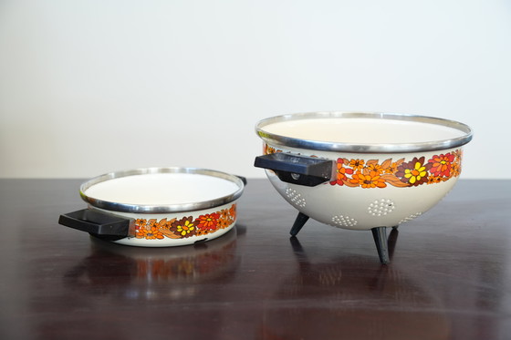 Verfraai je keuken met dit charmante mid-century duo: een vergiet met emaille coating en bijpassende kookpot, beide versierd met een warme retro bloemenband. Perfect voor verzamelaars en thuiskoks die op zoek zijn naar authentieke jaren 1950 flair en functioneel design.