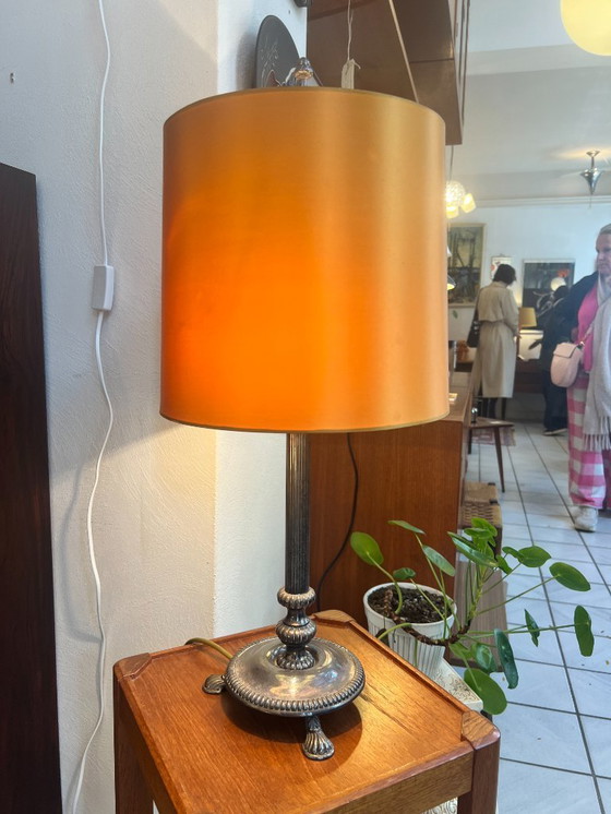 Een zeer stijlvolle klassieke sierlijke tafellamp / schemerlamp welke staat op een prachtige verzilverde voet. De is afgewerkt in mooie details en staat op kleine leeuwenpootjes. Aan de bovenzijde heeft hij een eveneens verzilverd ornament. De kap is goudkleurig. De lamp is voorzien van een tweetal fittingen en is nog volledig origineel. Gemaakt in de 1950's in Nederland. In nette werkende conditie, aan de binnenkant gemerkt.