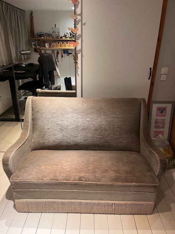 Ervaar de charme van vervlogen tijden met deze prachtige vintage 2-zits bank. Dit meubelstuk straalt een tijdloze elegantie uit die moeiteloos in elk interieur past. De warme groen/bruine tinten van de bekleding geven een gevoel van comfort en gezelligheid, terwijl de klassieke lijnen en details een vleugje nostalgie toevoegen.