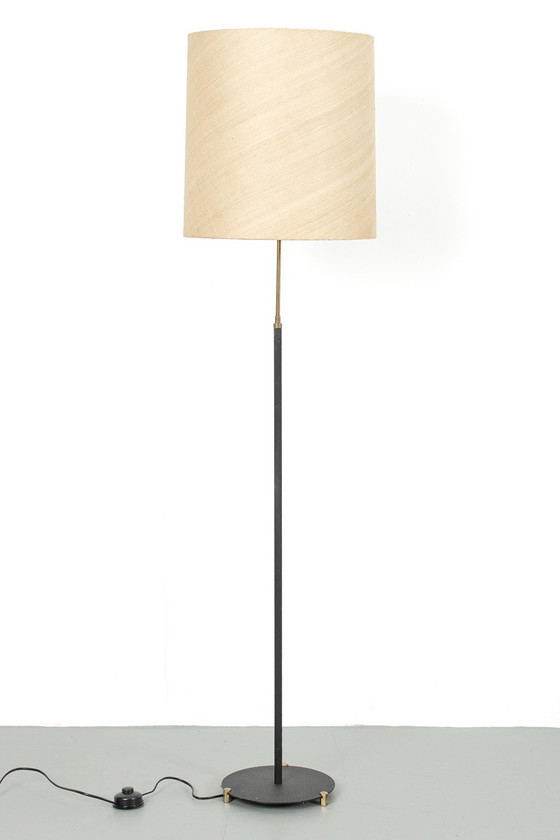 Vintage 60’s vloerlamp met mooie details zoals krimplak en messing delen. De kap heeft helaas bij de naad een vlek. Deze valt niet op als je de lamp in een hoek of met als achtergrond een muur plaatst. Anders zou je hem nog kunnen vervangen.De lamp is verder in een goede vintage staat.
