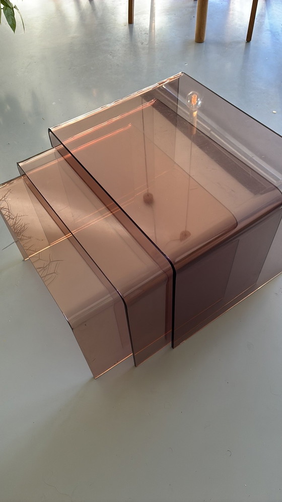 Prachtige sfeervolle bijzettafels jaren 70. De set bestaat uit drie tafeltjes van verschillende groottes die als individuele bijzettafels gebruikt kunnen worden of als één trapsgewijze eenheid. Vervaardigd uit hoogwaardig acryl of plexiglas (soms 'rookglas' genoemd vanwege de bruine tint).