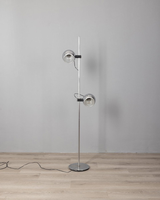 Verchroomd metalen lamp met twee verstelbare bolvormige lampenkappen, ontwerp Goffredo Reggiani, jaren 1970.