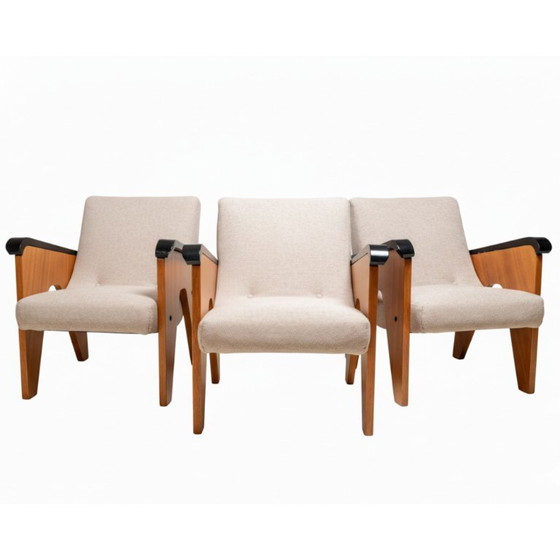 Een set van drie vintage houten fauteuils met een kenmerkend A-vormig zijprofiel, typerend voor Tsjechisch meubeldesign uit het midden van de 20e eeuw. Deze fauteuils worden toegeschreven aan UP Závody en zijn stilistisch verbonden met het werk van Jan Vaněk, die actief was in Tsjecho-Slowakije in de naoorlogse periode.