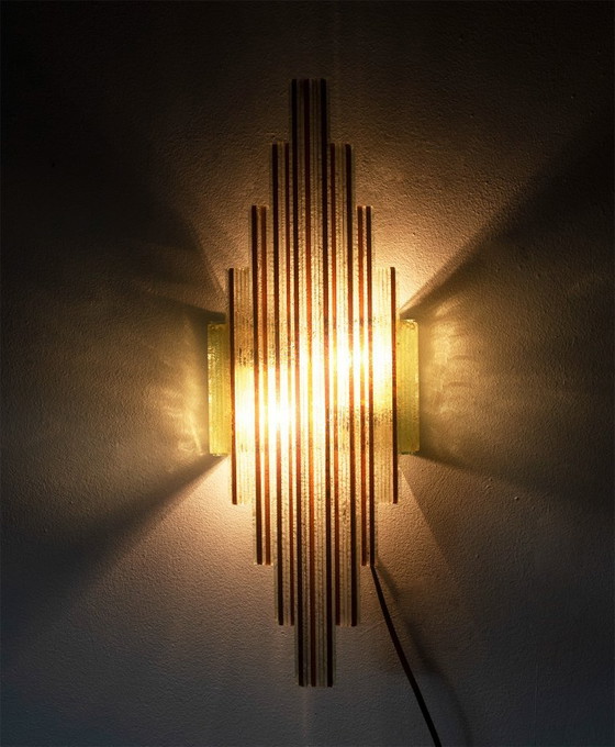 In deze wandlamp werd gebruikt gemaakt van gehamerd muranoglas, de grove structuur van het glas resulteert in een zeer mooie belichting van het lichtobject zelf als ook de wand waar tegen de lamp wordt geplaatst.