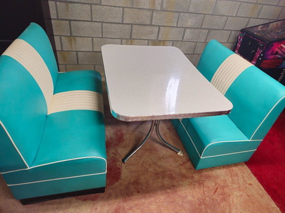 Amerikaans (made in USA - meegenomen uit mijn periode als expat aldaar begin jaren 2000 vervaardigd) vintage americana fifties bankset met tafel. Behoeft wat restauratie (zie foto's) maar kan ook zo gebruikt worden. Ideaal voor man cave.