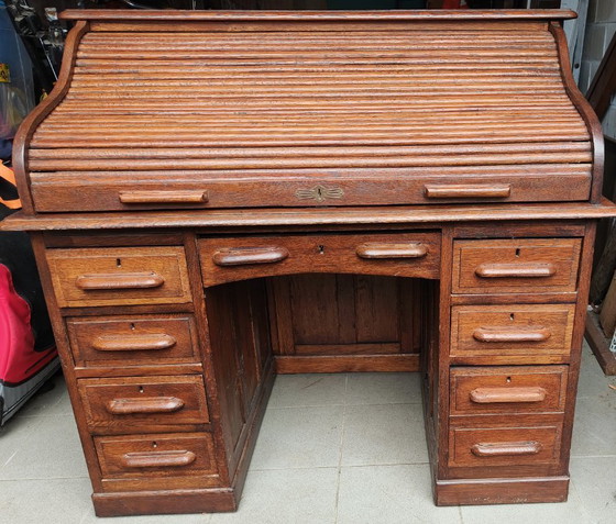 Deze antieke bureau is prachtig decoratief in de woonkamer en ook heel geschikt om te gebruiken als home office. Heel veel opbergruimte, mooie binnen-vakjes en leuke schuifjes, geheime lade voor sleutel of pen. Rolluik werkt heel vlot. Een bureaustoel past in de opening. Geen sleutels beschikbaar.