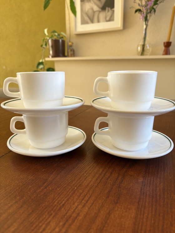 Mooie set van 4 vintage Arcopal kop en schotels in restaurantstijl. Gemaakt van stevig gehard glas en voorzien van een subtiele groene rand. Perfect voor koffie of thee en ideaal voor liefhebbers van retro servies!