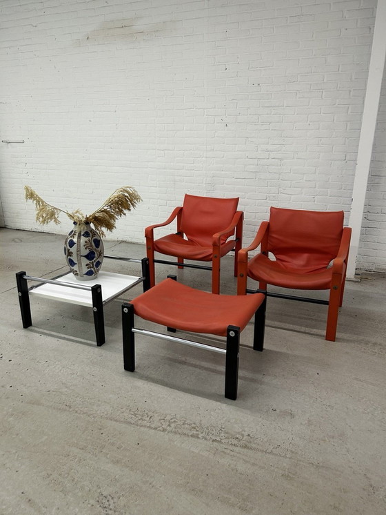 2 Arkana Limited Chelsea chairs inclusief bijbehorende Arkana tafel en poef. De genoemde prijs is voor de complete set. Deze designer set is een iconische midcentury eyecatcher, ontworpen door Maurice Burke. De Arkana salontafel is leuk omdat het blad op 2 hoogtes geplaatst kan worden. De set heeft gebruikerssporen door leeftijd en gebruik (zie foto's) verder verkeerd het in stevige staat.