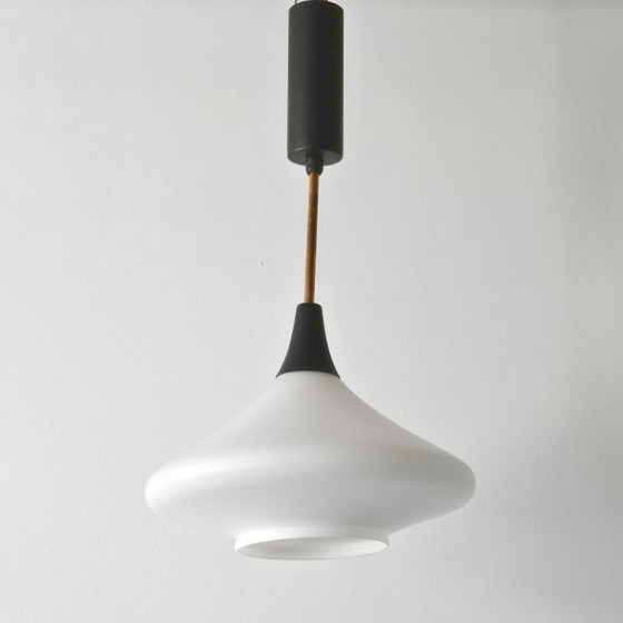 Vintage Arlus House hanglamp uit de jaren 50 in opaalglas, messing en metaal.