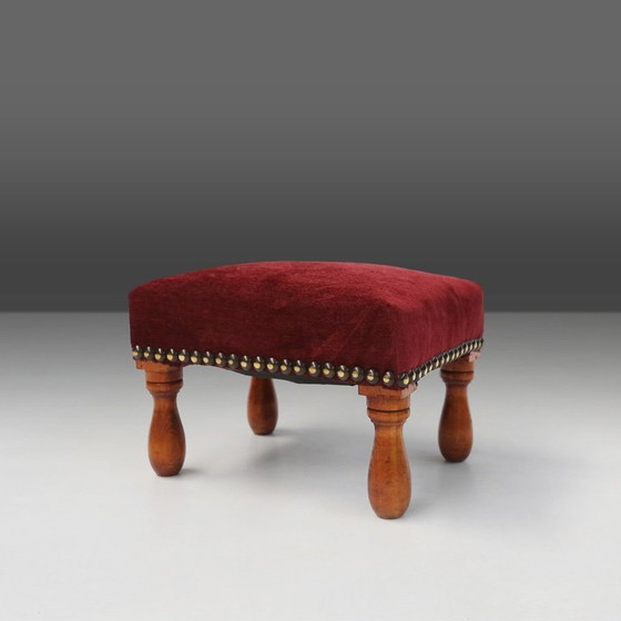 Rood fluwelen Art Deco krukje gemaakt rond 1930. Deze elegante lage tabouret is opnieuw bekleed met rood fluweel en rust op 4 mooi gedraaide poten in vol hout. De dieprode stof is afgewerkt met decoratieve metalen noppen.