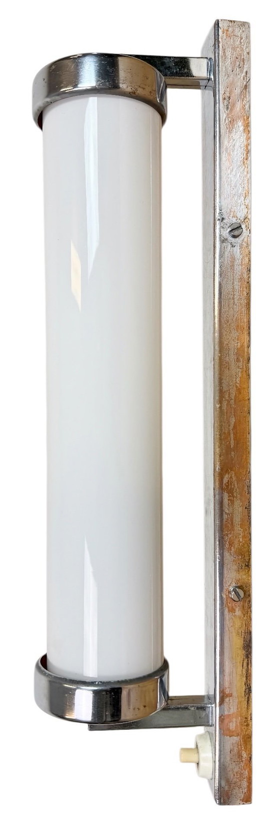 Vintage art deco lamp, gemaakt in het voormalige Tsjecho-Slowakije in de jaren 30. De lamp heeft een roestige, verchroomde metalen wandmontage met schakelaar en opaalglas. De fitting is geschikt voor standaard E14-lampen. Nieuwe bedrading. Het gewicht van de lamp is 0,6 kg.