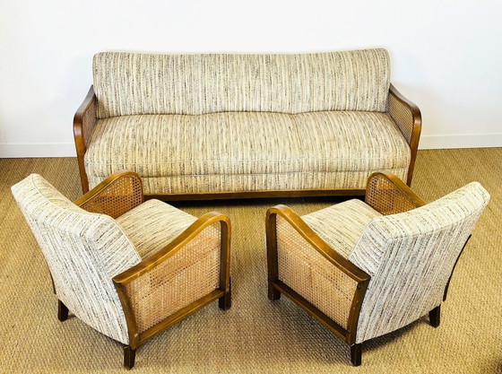 Vintage Art Deco woonkamerset van gebogen hout en riet, 1950, set van 3