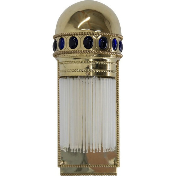 Prachtige Art Nouveau wandlamp bestaat uit messing voet, donkerblauwe glazen stenen en kristallen kralen. Het armatuur creëert een interessant lichtpatroon op de muur en op de vloer.