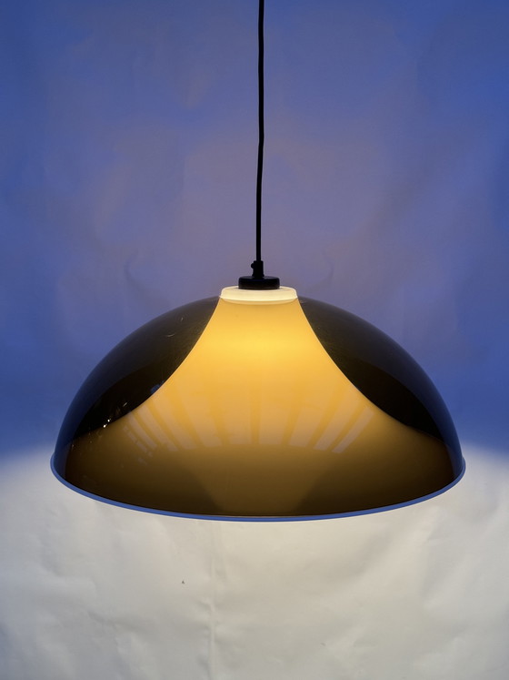 De lamp bestaat uit twee grote plastic kappen die in elkaar zijn geplaatst. Wanneer de lamp brandt, creëert dit dubbellaagse ontwerp een bijzonder warm en sfeervol lichteffect; een kenmerkend element van het Space Age-design uit deze periode.