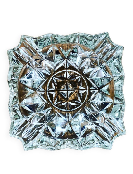 Echt antiek 70's geslepen glazen asbak Afmetingen: 14cm x 14cm Superzwaar gewicht en uitstekende kwaliteit Ideaal voor brocante chic, art deco, vintage of seventies deco.