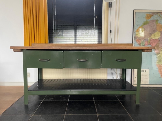 Ga terug in de tijd met deze prachtige vintage bakkerstafel, een toonbeeld van duurzaam vakmanschap en tijdloos design. Deze tafel, met zijn robuuste houten blad en stevige metalen frame, biedt zowel functionaliteit als een vleugje nostalgie voor elke ruimte.