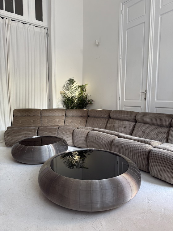 Ontdek deze weelderige vintage sofa, samengesteld uit negen modulaire elementen, ideaal voor liefhebbers van retro design. Deze sofa onderscheidt zich door zijn elegante uitstraling en uitzonderlijke comfort, perfect om uw woonkamer te verfraaien.