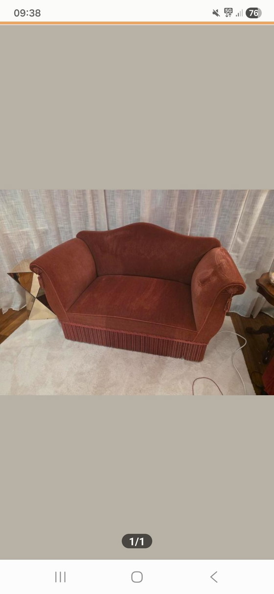Dit charmante vintage bankje in oudroze is een echte blikvanger voor je interieur. Met zijn zachte fluwelen bekleding en klassieke lijnen brengt het een vleugje nostalgie in elke kamer. Perfect voor een knusse hoek of als stijlvol accent in je woonkamer.