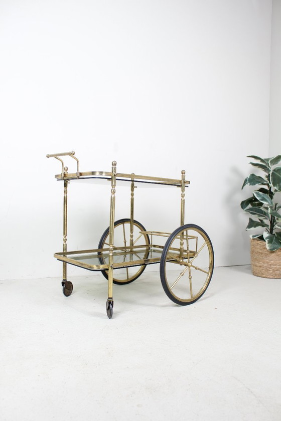 Vintage barcart of serveerwagen uit de jaren '50. Dit drankkarretje is gemaakt van messing en heeft twee glazen bladen.