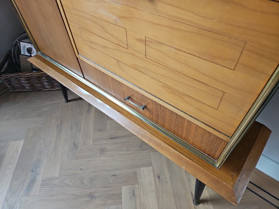 Deze prachtige vintage barkast voegt een vleugje retro charme toe aan elke ruimte. Met zijn warme houttinten en elegante glazen details, is het een perfecte aanvulling voor zowel moderne als klassieke interieurs. De kast biedt voldoende opbergruimte met zijn handige lades en glazen planken, ideaal voor het uitstallen van uw favoriete glazen of flessen. De metalen accenten geven het geheel een verfijnde uitstraling. Ontdek de veelzijdigheid van deze barkast en laat hem het middelpunt van uw woonkamer worden.