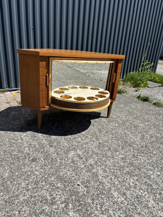 Deze vintage hoekkast is een charmante aanwinst voor elk huis, met een klassiek ontwerp en een warme bruine houten afwerking. Het bevat een unieke roterende plank met crèmekleurige plastic inzetstukken, perfect voor het uitstallen of bewaren van flessen en glazen. De kast is stevig en goed gemaakt, ideaal voor gebruik als drankkast of decoratief stuk. Het compacte formaat maakt het geschikt voor verschillende ruimtes en voegt een vleugje vintage elegantie toe.
