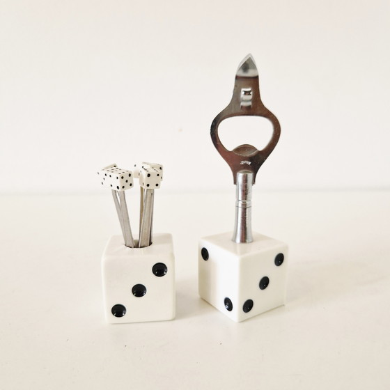 Stap terug in de tijd met deze charmante vintage barset, perfect voor liefhebbers van de jaren vijftig. Deze set, bestaande uit een flesopener en cocktailprikkers, is ontworpen in de vorm van dobbelstenen en voegt een speelse en unieke touch toe aan uw bar of keuken.