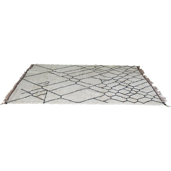 Groot Beni Ouarain tapijt met de hand geweven in de Marokkaanse bergen van de Midden Atlas. De Beni Ouarain tapijten worden geprezen om hun strakke stijl en hun zeer grafische patronen en behoren tot de meest kwalitatieve Berbertapijten. De wol die gebruikt wordt is namelijk zuiver, afkomstig van het scheren van een levend schaap. Het werk van de wol is geknoopt. De wever voegt één voor één kleine knoopjes wol toe. Het tapijt heeft prachtige afmetingen en past zich aan alle stijlen aan, waardoor het karakter en elegantie uitstraalt.