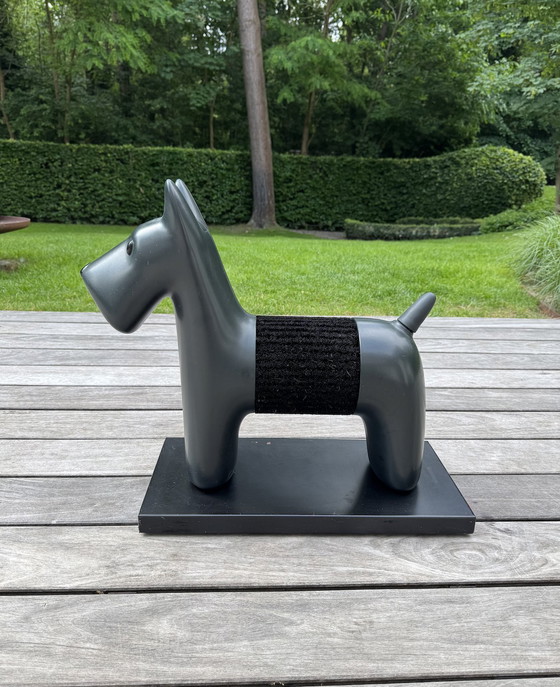 Benny Brush schoenpoetsmachine. Stefano Giovannoni ontwierp voor Authentics een originele, elektrische schoenpoetsmachine, niet alleen in de vorm van een vos terriër hond, maar ook op ware grootte, gemaakt van robuust plastic met een stabiele metalen basis. De borstel van natuurlijk haar en synthetische vezels die rond de buik en rug draait, brengt alle schoenleersoorten in een handomdraai op hoogglans. Stefano Giovannoni bespaart ons het vervelende buigen en poetsen met een standaard schoenborstel met dit buitengewone ontwerp voor Authentics. Stap gewoon op de handig te bedienen schakelaar en houd de schoen onder, over of opzij op de geduldige hondenpoetsmachine Benny Brush en verbaas je vervolgens over de rondom gepoetste schoenen.