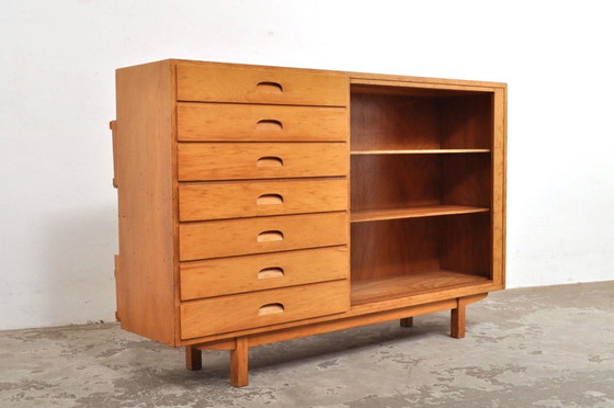 Beukenhouten ladekast met 7 laden. Jaren 50. Afkomstig uit een school. Aan de achterzijde van de kast bevindt zich een tijdschriftenrek wat bijzonder is. De kast kan dus in de vrije ruimte staan of haaks tegen de wand.