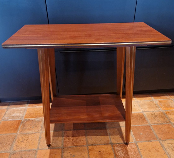 Fraaie Hollands fabrikaat: KA meubelen. Scandinavisch design De tafel heeft 4 wieltjes die alle mogelijke kanten op kunnen draaien. Is stabiel en in zeer goede staat. De tafel multifunctioneel te gebruiken als drankwagen / drankkar / theewagen / bijzettafel / serveerwagen / trolley, tvkastje, sidetable, side table. Mid-century, Midcentury, Deens, teak poten en bovenblad fineer, afgewerkt met koperkleurige bies. Zeer lichte gebruikerssporen naar ouderdom