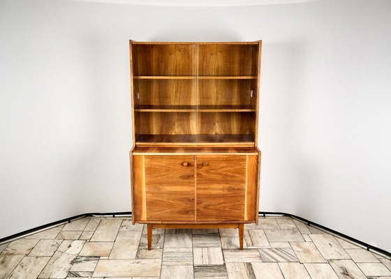 Het meubelstuk is gefineerd met walnoot en afgewerkt met glanzende schellak. Het verkeert in zeer goede vintage staat, zonder grote gebreken.