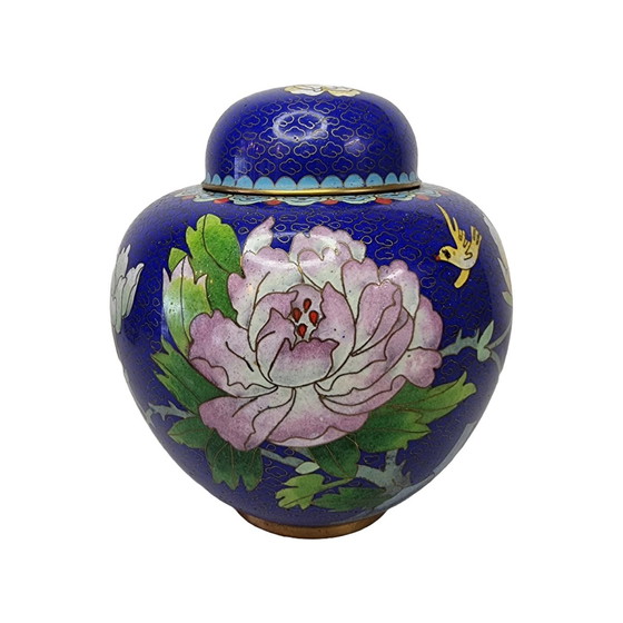 Vintage Chinese gemberpot. Deze prachtige blauwe cloisonné heeft zeer unieke details zoals vogeltjes en een roze bloem. De gemberpot is gemaakt omstreeks de jaren 80. De techniek van de gemberpot is echt prachtig en hij is in een zeer mooie staat.