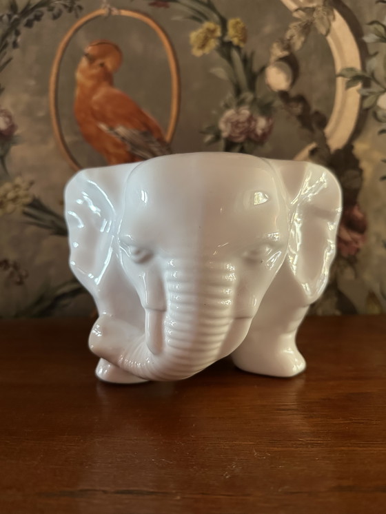 Deze vintage porseleinen olifantenpot uit de jaren 1970 is een charmante toevoeging aan elk interieur. De elegante witte afwerking en het gedetailleerde olifantenontwerp maken er een uniek stuk van. Perfect voor kleine planten of als decoratief object, het voegt een vleugje vintage charme toe aan elke kamer.