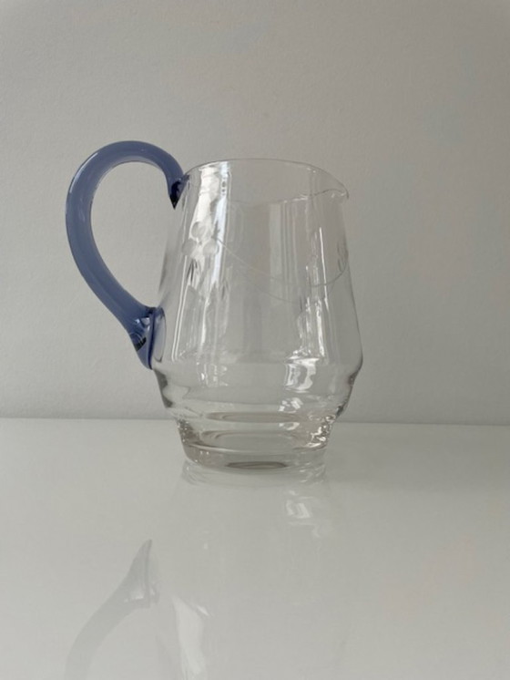 Vintage mondgeblazen schenkkan van Boheems glas met ingeslepen, gestileerde motieven. Het helderblauwe handvat geeft een sterk contrast met het heldere glas.