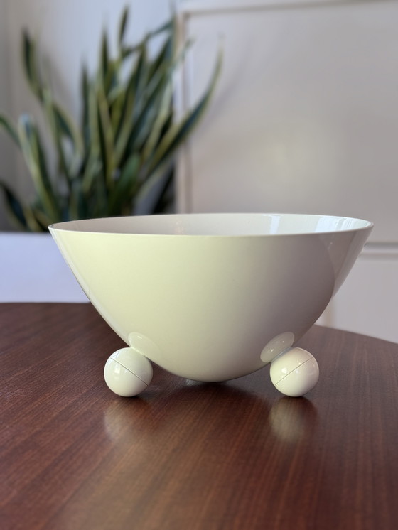 Speelse en stijlvolle vintage fruitschaal van Brabantia, uitgevoerd in wit kunststof en geplaatst op karakteristieke bolvormige pootjes. Het ontwerp is typisch voor het Space Age / postmodern design uit de late jaren 70 tot jaren 80, een periode waarin Brabantia experimenteerde met sculpturale vormen en innovatieve kunststoffen.