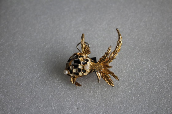 Vintage broche, abstract vismotief, goudkleurig metaal met emaille en parels.