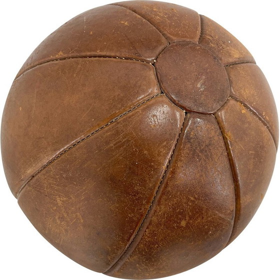 Originele vintage zware leren trainingsbal met prachtig patina. De bal is gemaakt van handgestikt echt leer in voormalig Tsjecho-Slowakije in de jaren 1930. Hij kan worden gebruikt als een origineel interieuraccessoire of als een stijlvol trainingshulpmiddel. De leren hoes is in originele staat, hij is schoongemaakt en behandeld met een ecologisch leerimpregneermiddel.