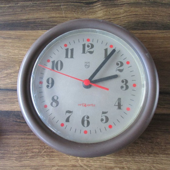 Vintage bruine ronde Philips HR5476 Quartz wandklok uit de jaren 70.