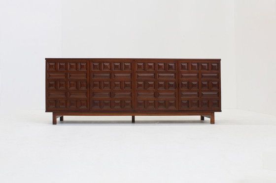 Vintage Spaans brutalist dressoir met een geometrisch paneelfront. Prachtig stuk uit de jaren 70 ,Spanje. Uitstekend houtvakmanschap. Veel opbergruimte met 4 deuren en lades.In goede staat met minimale gebruikssporen die passen bij de leeftijd.