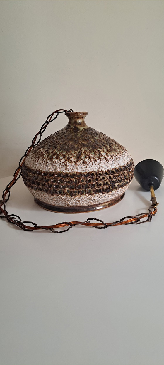 Reis terug in de tijd met deze prachtige vintage brutalistische hanglamp van de gerenommeerde Sejer-fabriek, vervaardigd in de jaren 60. Dit stuk belichaamt de rauwe en robuuste esthetiek van de brutalistische beweging en is daarmee een opvallende aanwinst voor elk interieur. Het gestructureerde keramische oppervlak van de lamp, versierd met aardse bruine en witte tinten, creëert een boeiend spel van licht en schaduw, wat de sculpturale uitstraling versterkt.