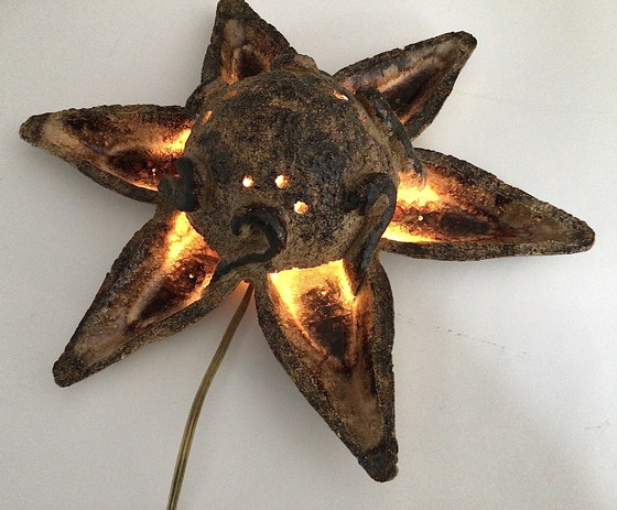 Vintage handgemaakte wandlamp. In de vorm van een ster, zon, bloem of zeester. Stijl: brutalistisch.