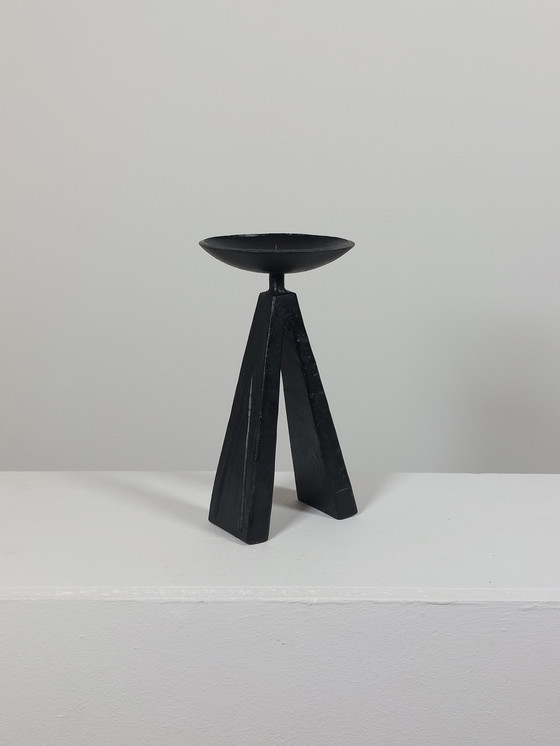 Deze brutalistische zwarte kandelaar belichaamt een sacrale maar moderne esthetiek en verrijkt elke ruimte met een vleugje mystiek. De robuuste metalen constructie en het opvallende ontwerp maken het tot een opvallend decoratief object dat indruk maakt in zowel traditionele als moderne interieurs.
