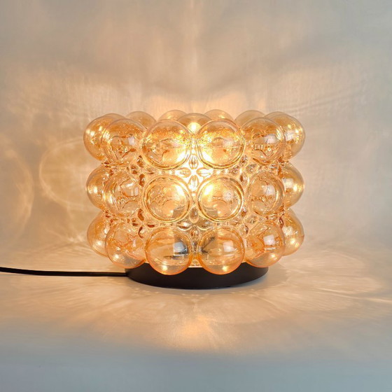 Iconische vintage bubbel plafondlamp / hanglamp van Glashütte Limburg, ontworpen door Helena Tynell. Deze lamp is een prachtig voorbeeld van Duits design uit de tweede helft van de 20e eeuw, met een karakteristieke bolvormige glazen kap en subtiele luchtbelstructuur die zorgt voor een warm en speels lichteffect.