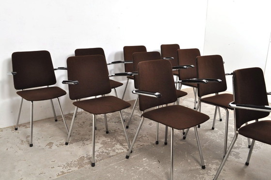 Grote partij buisframestoelen met bakelieten armleuningen en stoffen bekleding. Rechtsstreeks afkomstig uit een Nederlands klooster en in goede staat.